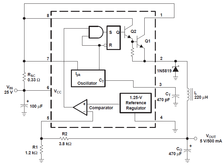 あまりデバイスを食い散らかしたくなく、以前から検討によく使う MC34063 が使えるなら使いたいです。まだ現行品ですし取り出せる電流も大きい、昇圧、降圧、反転と応用範囲も広く値段も高くない、と好都合な点が多いですが、気になるのは、降圧した電源はリニアレギュレータで「整える」ことをせずそのまま楽器用途に使えるかという点です。スイッチングノイズが漏れてきたりしないかな?まずは実際に降圧回路を組んで検討してみます。