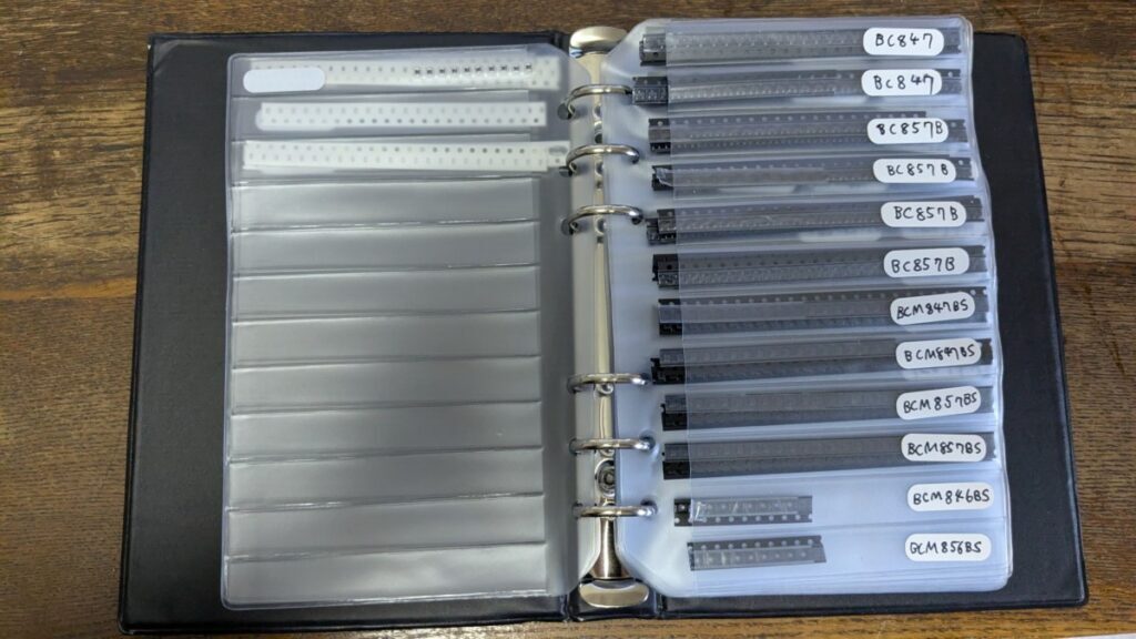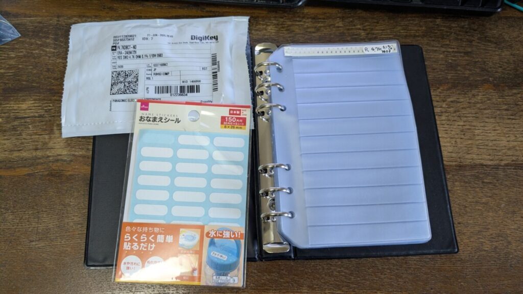 どうしようかと思案していましたのですが、部品の入っていない空のサンプル本が売られているのを AliExpress で発見、早速注文しました。百均に行ってラベルにするおなまえシールを購入。これで管理してみます。