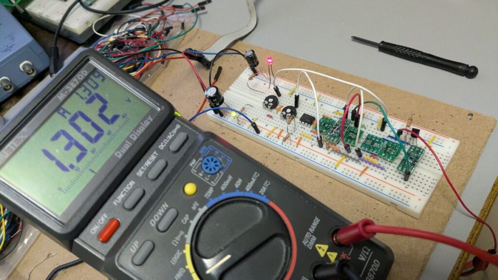 Then built the circuit on a breadboard. But the result was not good. The offset at 5V CV with no input is too large.