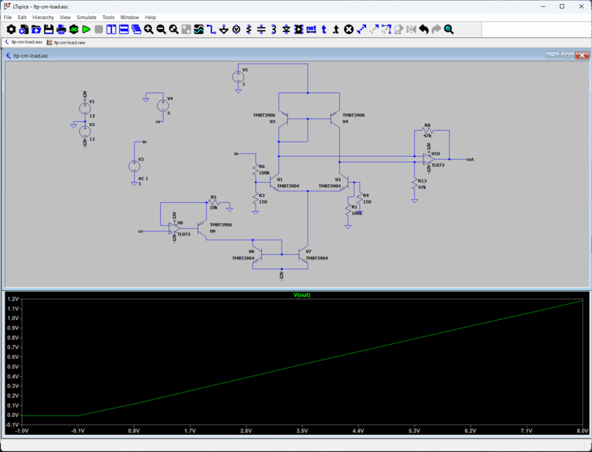 A differential amp using a BJT pair often uses current mirror as its load to boost gain. I was interested in applying the idea to a long-tail-pair VCA, so tried it. I first ran a simulation with the circuit as follows to ensure it works as a VCA properly.