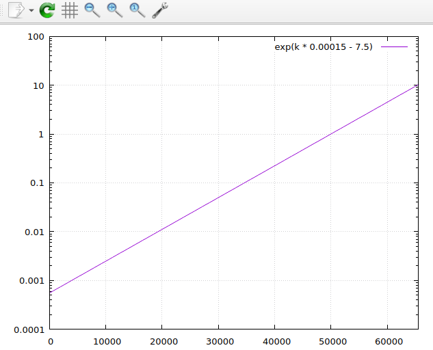 gnuplot> plot [k=0:65535] exp(k * 0.00015 - 7.5)Bashここから減衰率は