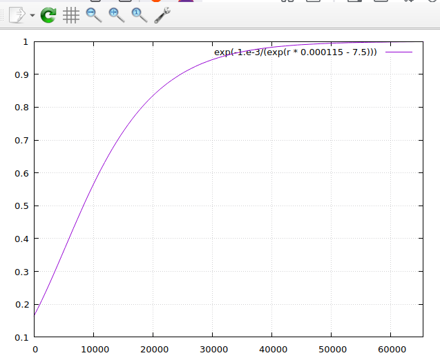 gnuplot> plot [r=0:65535] exp(-1.e-3/(exp(r * 0.000115 - 7.5)))Bash