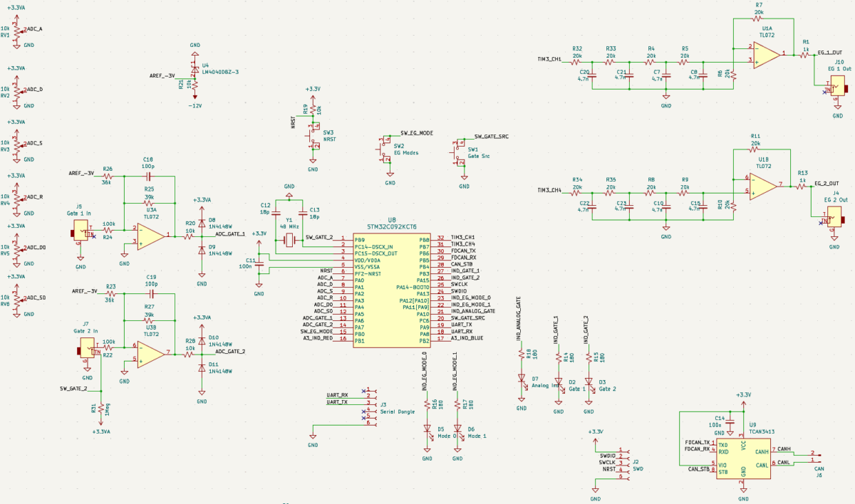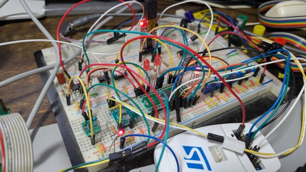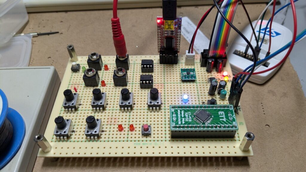 ファームウェアの演算量が楽になるので出力は PWM 方式にしましたが、耳が慣れたら更新周期のバタバタが聞こえるようになってしまい、かなりきつめの平滑フィルタをかけることになってしまいました。カットオフ周波数 1.7 kHz の 4 次のフィルタでようやくノイズが聞こえにくくなり、でもさすがにエンベロープの変化も丸まってしまい若干出音がもさったくなってしまいました。しばらくはこの回路で行きますが DAC 外付け方式も後で検討したくもあります。しかしユニバーサル基板の配線は苦手で丸二日かかってしまいました。あれをもう一度やると思うとなかなか踏ん切りがつかないかもしれません。