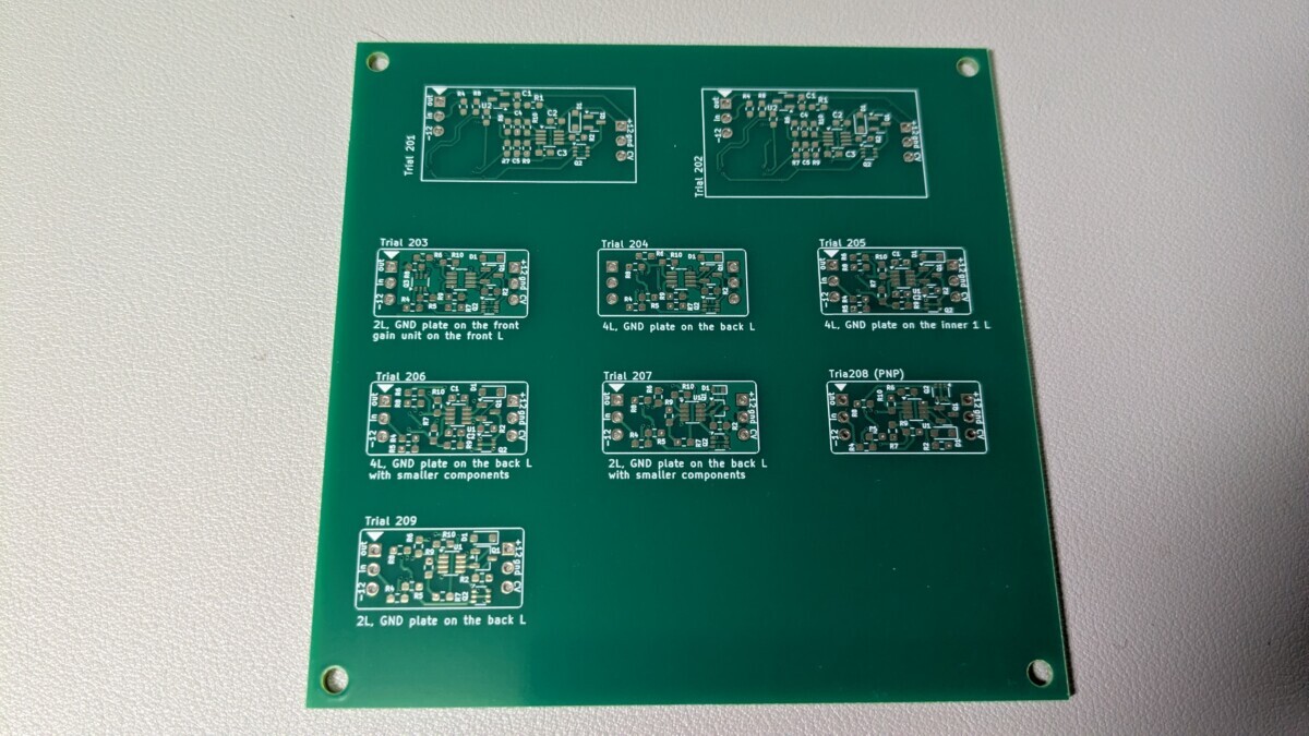 試行錯誤してみて感じるのが、ゲインユニットが他の部品と同一平面上にあると大きなオフセットが出るらしいこと。ですが、そうなる理由の説明が全く思いつきません。したがってどんなふうに設計を直せばよいかもわからずあてずっぽうの設計変更をしているのですが、それでは改善しませんでした。上写真右上の版のように、トランジスタを遠く離してもだめでした。