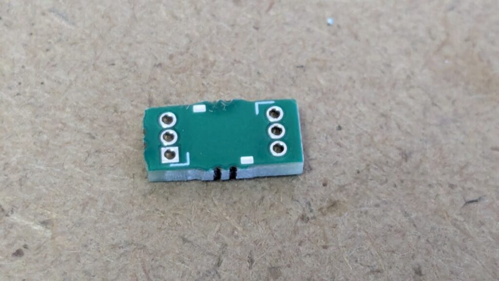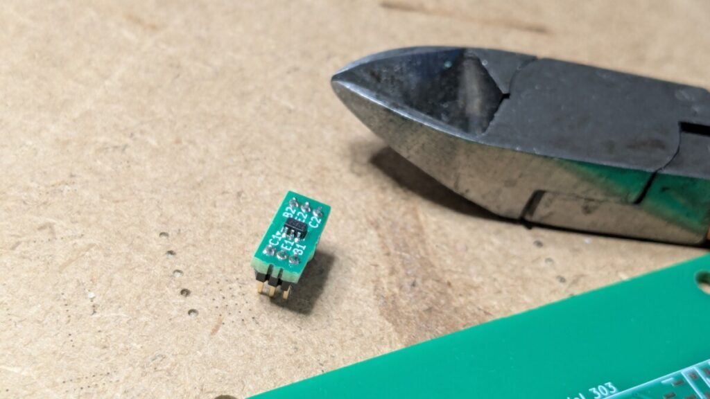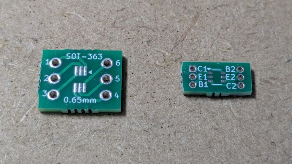 しかしあきらめずに第三弾、今度は、ゲインユニットが同一平面になければ良いのではないか、という予想のもとに、極小のブレイクアウトボードを作ってゲインユニットを浮かせることにしました。下の写真の右側が新しく作ったブレイクアウトボードです。左は普段 SOT-363 に使っている 2.54mm ピッチのブレイクアウトボードです。足は 1.25mm ピッチです。面積が無駄に広いように見えるのは、裏面に銅箔を張ってシールド効果を狙っているのと、少し広く作るとブレイクアウトボードの真下に何個か部品を配置することもできるため基板の設計が楽になるためという理由があります。