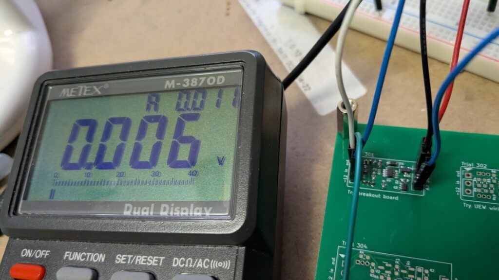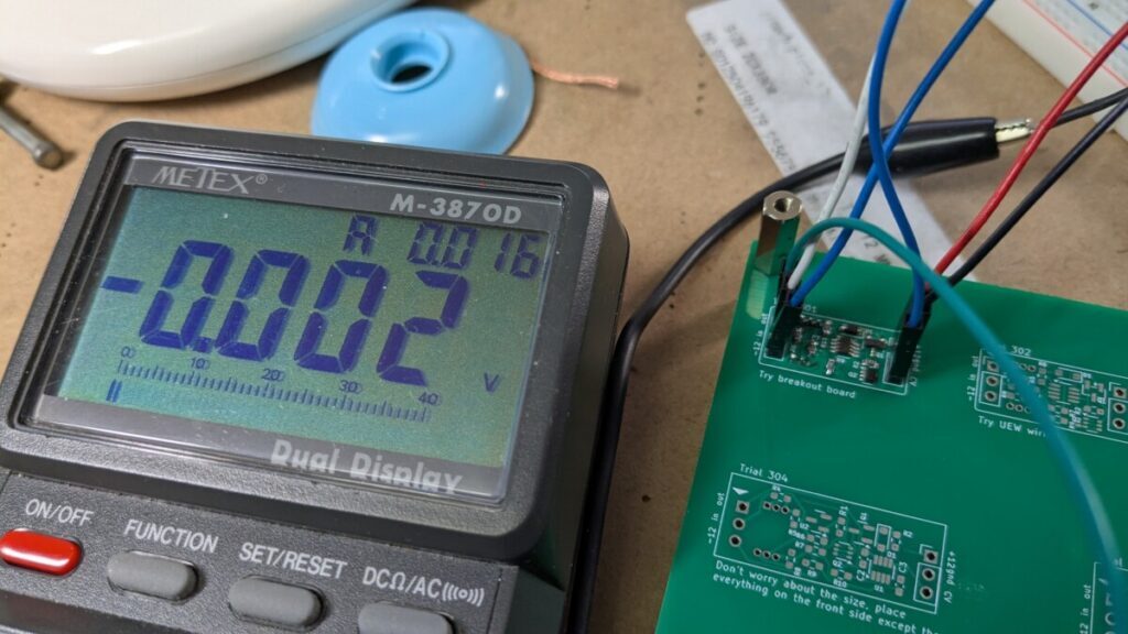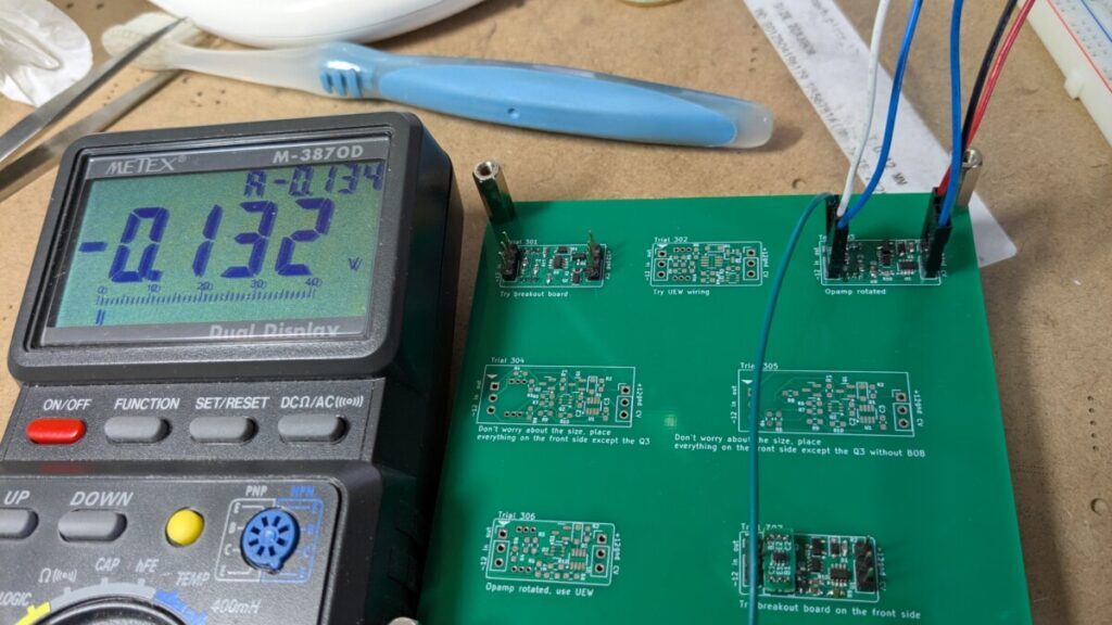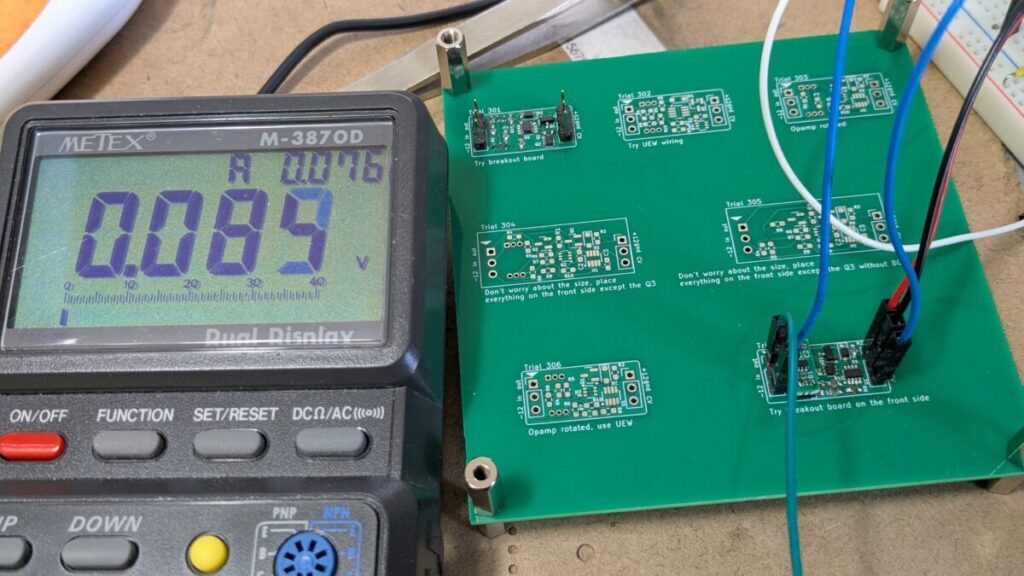 実験基板には似た設計の違う版がいくつか載っています。UEW 配線が必要な版もありますがそれはできれば避けたかったので UEW 不要の別版二つを試しましたがどちらもダメな様子。回路は全く同じですが、どちらも良好な版とはオペアンプの向きが違います。それだけでこれだけ変わっちゃうの?と思います。依然謎は深いです。ゲインユニットを表に配置したものと裏に置いたものでオフセットの極性が変わるのもまた不思議です。