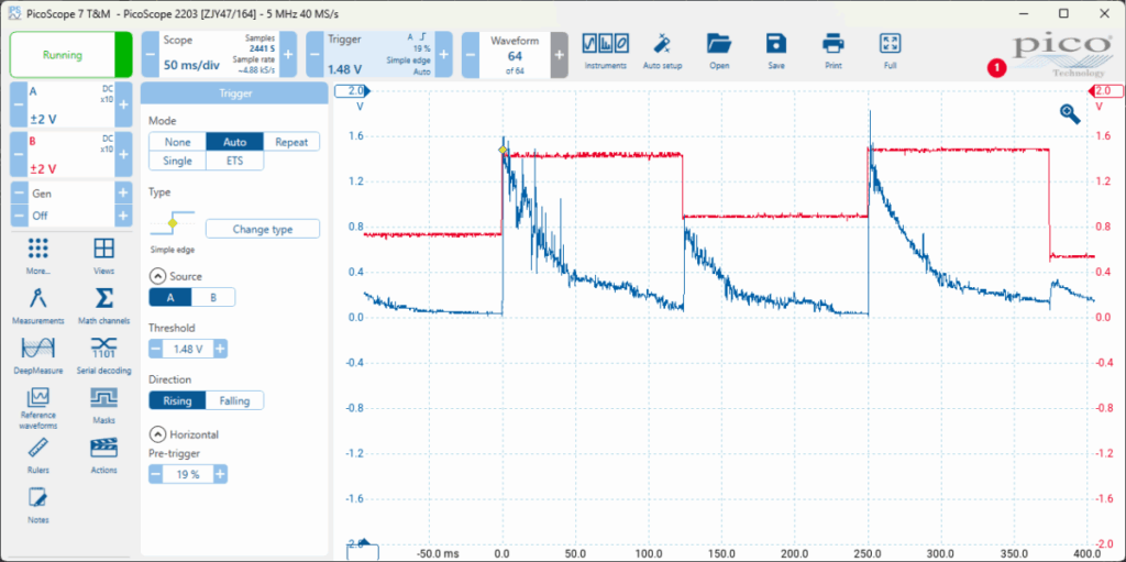 実際に指数関数の減衰曲線が得られているかをオシロスコープで確認しました。青線がエンベロープジェネレータの出力、赤線が比較器に入れているアタックレベルの電圧です。目論見通り指数関数の減衰ができています。またベロシティー制御も狙い通りにできています。