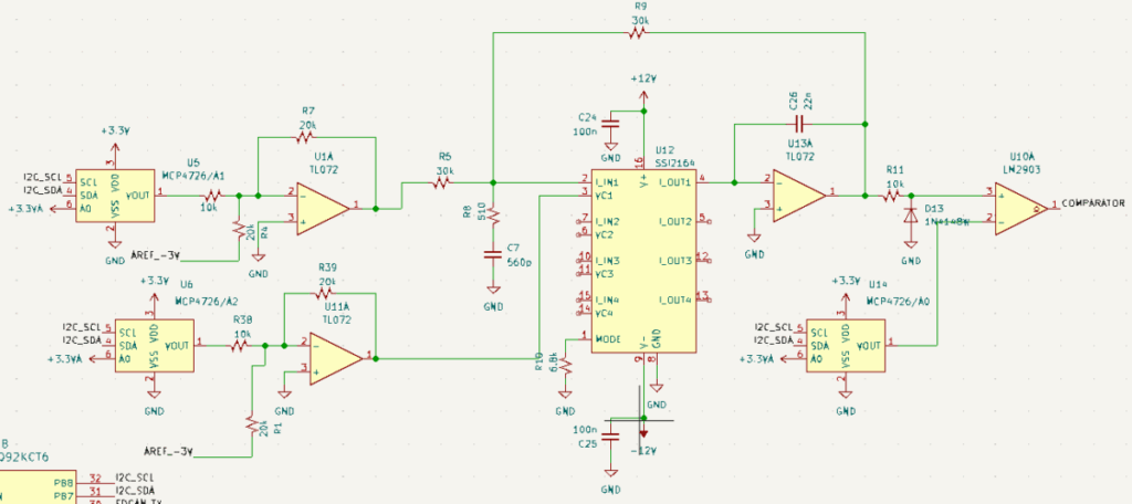 12bit DAC を三台も使うコスト度外視設計です。まずは PoC に集中してコストのことは後で考えます。基本的な動作原理は OTA 版と同じです。積分器に VCA を介して負帰還をかけることによって一次の LPF を組んでいます。状態遷移のきっかけをつかむために U10A の比較器を使っており、U14 の DAC から比較器に与える電圧によってベロシティーに対応できます。U5 の DAC を使ってエンベロープの元になる励起電圧を発生します。U6 の DAC を使ってエンベロープの動きの速さを制御します。U5 と U6 はいわばアクセルとブレーキ、ここをソフトウェアで細かく制御したいという目論見ですが、まずは単純な ADSR をやってみてこの回路がそもそも動くのか確認します。