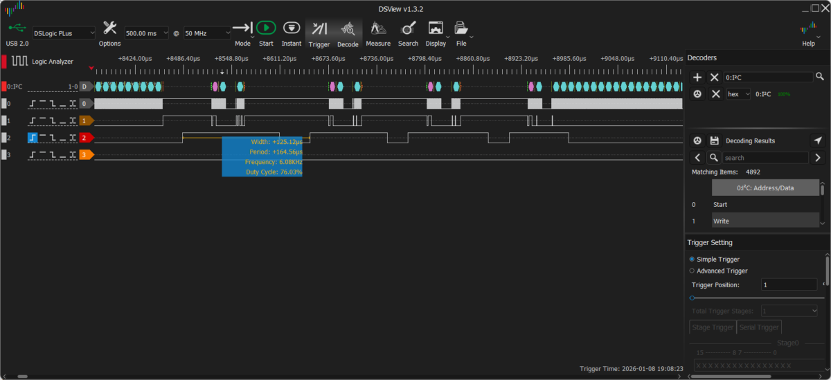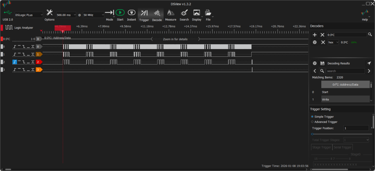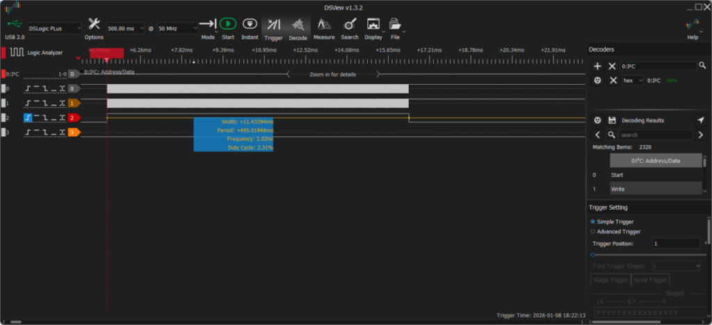 非同期処理にした結果、実行中にどれぐらいコントローラに処理を返せるか測定しました。以下の図は、非同期処理実行のためにコントローラを占有している間だけデバッグピンを立ち上げてそれを観測したものです。0, 1 チャネルが I2C で 2 チャネルがデバッグピンです。8ページあるので I2C が 8 回データ送信で忙しくなる様が見て取れますが、送信中はコントローラはフリーで他の処理に使うことができます。結局全体で 14 ms ほどかかっています。DMA ではどうしても直接送信より遅延が出がちなので多少は仕方がないところですが、11ms が 14ms なら十分でしょう。非同期処理のオーバーヘッドによる遅延も無視できる程度だと思われます。