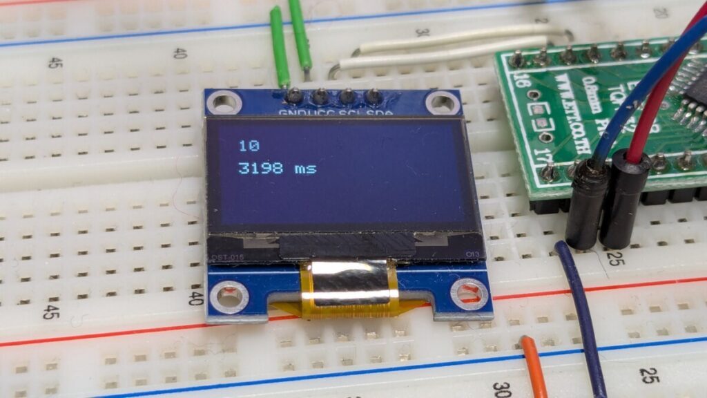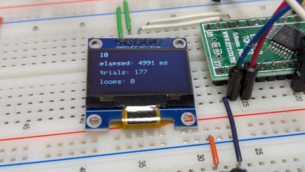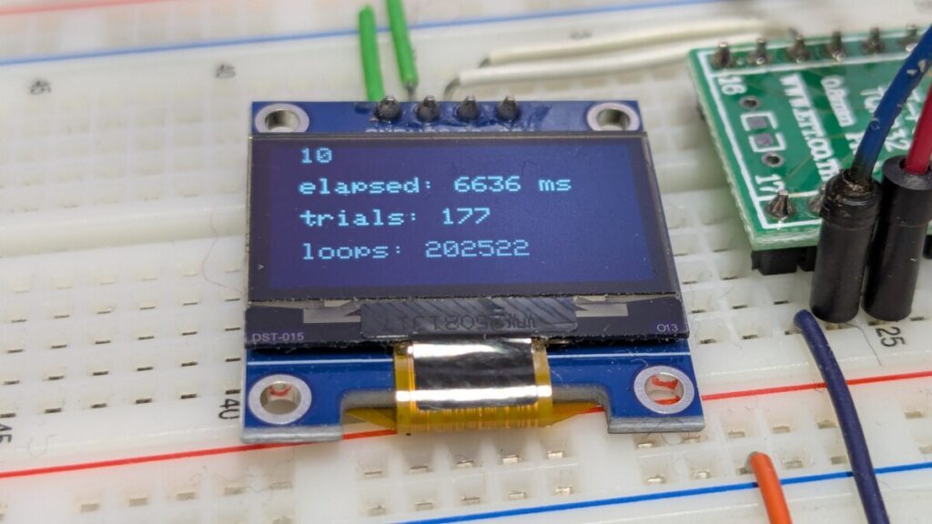 C なのでもとプログラムとほぼ同じです。IsPrime() 関数は上記のものと全く同じです。以下をメインプログラムに埋め込みます。途中結果の表示に SSD1306 を使っていますが約20万回のループのうち10回だけなので実行時間に影響は出ないでしょう。