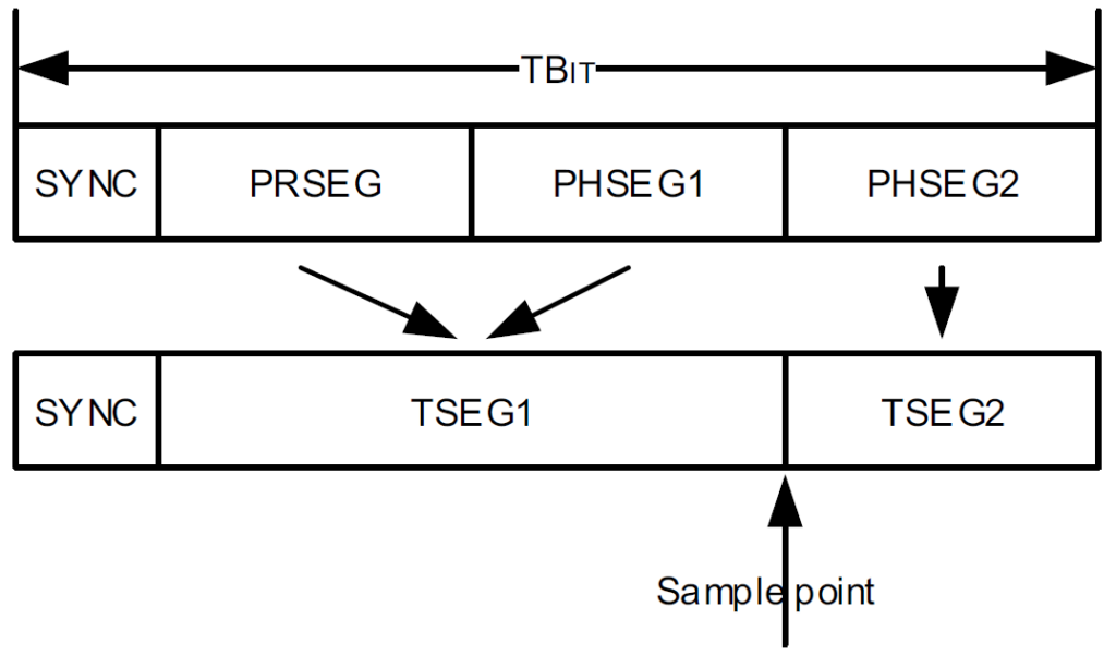 実際のデバイスへの設定では、これらの値を直接使わず PROP_SEG と PHASE_SEG1 を統合した TSEG1 と PHASE_SEG2 と同等の TSEG2 という値を使います。何故かどのデバイスも同様です。