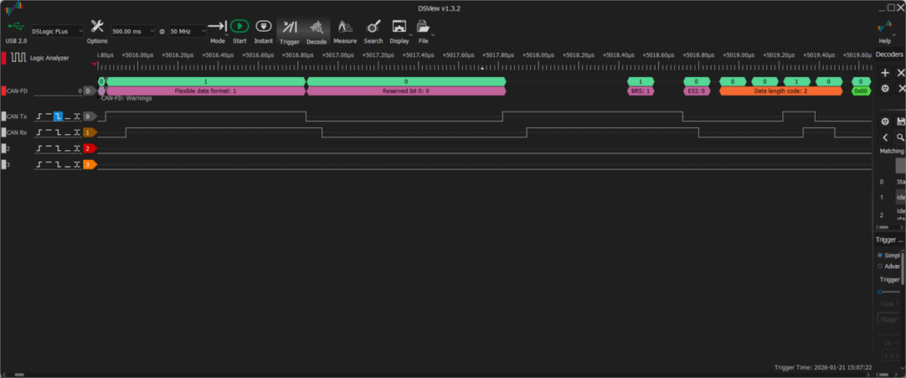下の図は実際に Nominal Bit Rate を 1 Mbps、Data Bit Rate を 6 Mbps に設定したときの Nominal 部から Data 部に切り替わる場所をキャプチャしたものです。上の波形が Tx、下の波形が Rx です。遅延による両者のずれが大きく、CAN では自分が送った信号を Rx でモニタしてデータに食い違いがないか見ていますが食い違いが生じてエラーになってしまいます。
