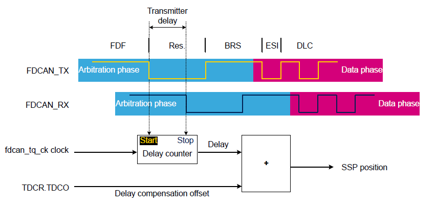 ここで、TDCO は Transmitter Delay Compensation Offset の略で、あらかじめ設定しておく基準点、Tdelay は測定した伝送遅延です。TDCO にはもともとの Sample Point を使えばとりあえずうまく通信するようです。それには TDCO は以下のように計算します